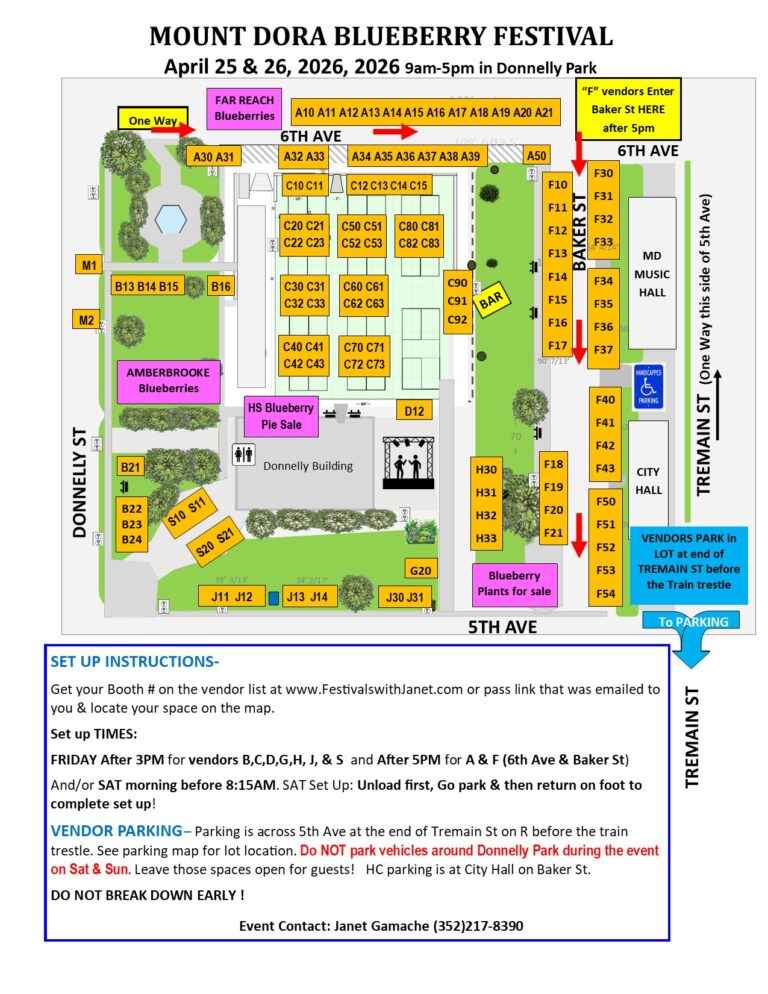 VENDOR PARKING– Parking is across 5th Ave at the end of Tremain St on R before the train trestle. See parking map for lot location. Do NOT park vehicles around Donnelly Park during the event on Sat & Sun. Leave those spaces open for guests! HC parking is at City Hall on Baker St.